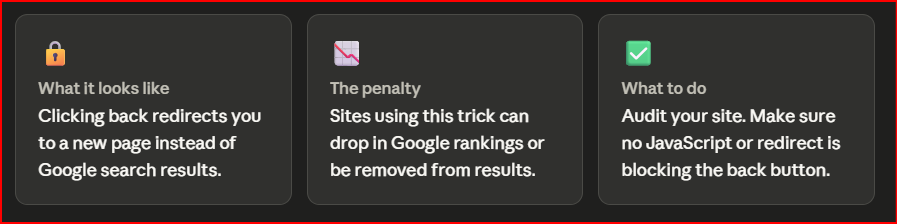 Google looks at signals like how quickly people leave a page, whether they come back to search results, and how long they stay. A site that traps users with back button tricks actually sends bad signals over time. Now, Google is making the penalty more direct and clear.